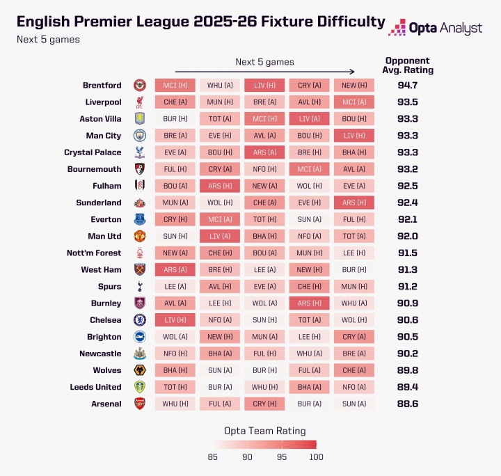 10月02日讯 Opta发布了25-26赛季翌日五轮赛程难度评级,数据分析露馅,布伦特福德将濒临最严峻的检修。