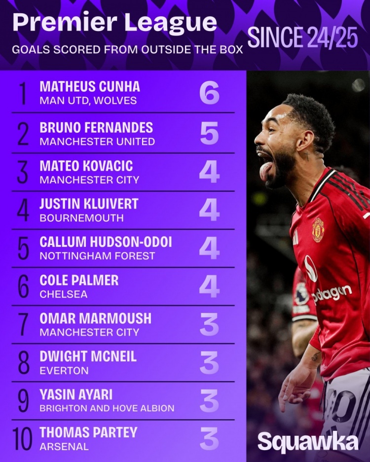 10月26日讯 曼联在本轮英超4-2力克布莱顿,库尼亚远射立功。数据统计涌现他亦然上赛季于今英超禁区外破门次数最多的球员。