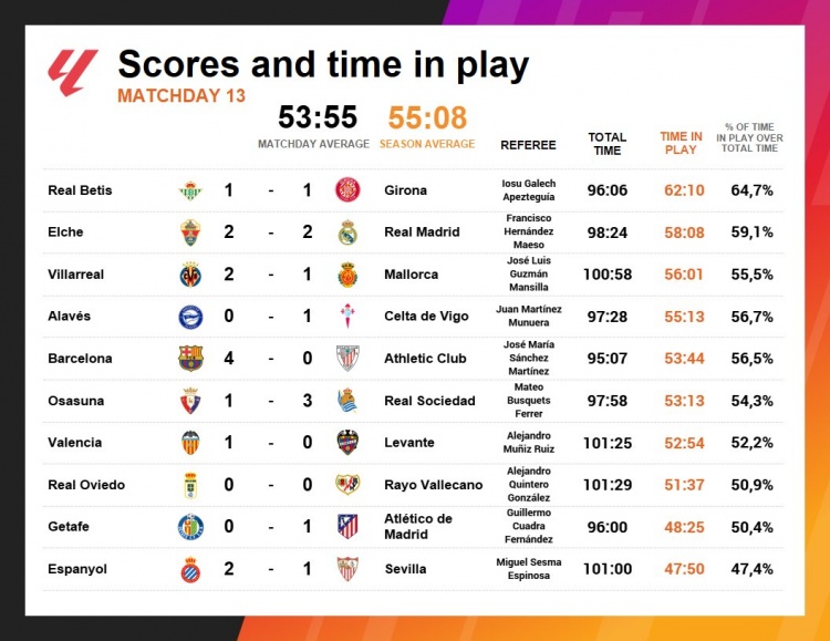 11月25日讯 Opta统计了西甲第13轮比赛的净比赛时辰,本轮场均净比赛时辰为53分钟55秒,而本赛季西甲场均净比赛时辰为55分钟8秒。