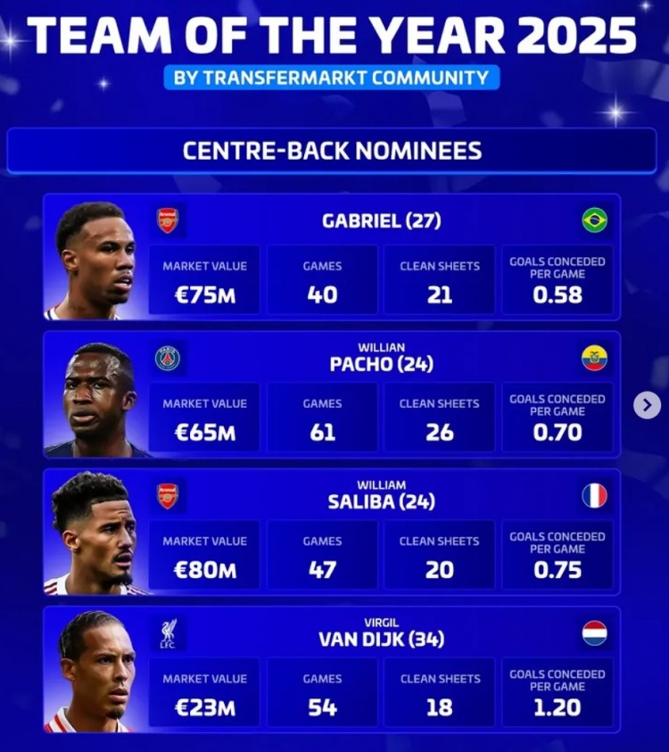 12月3日讯 《转会阛阓》评比2025年最好中卫,并排出了4东谈主候选同期对比了他们的数据: