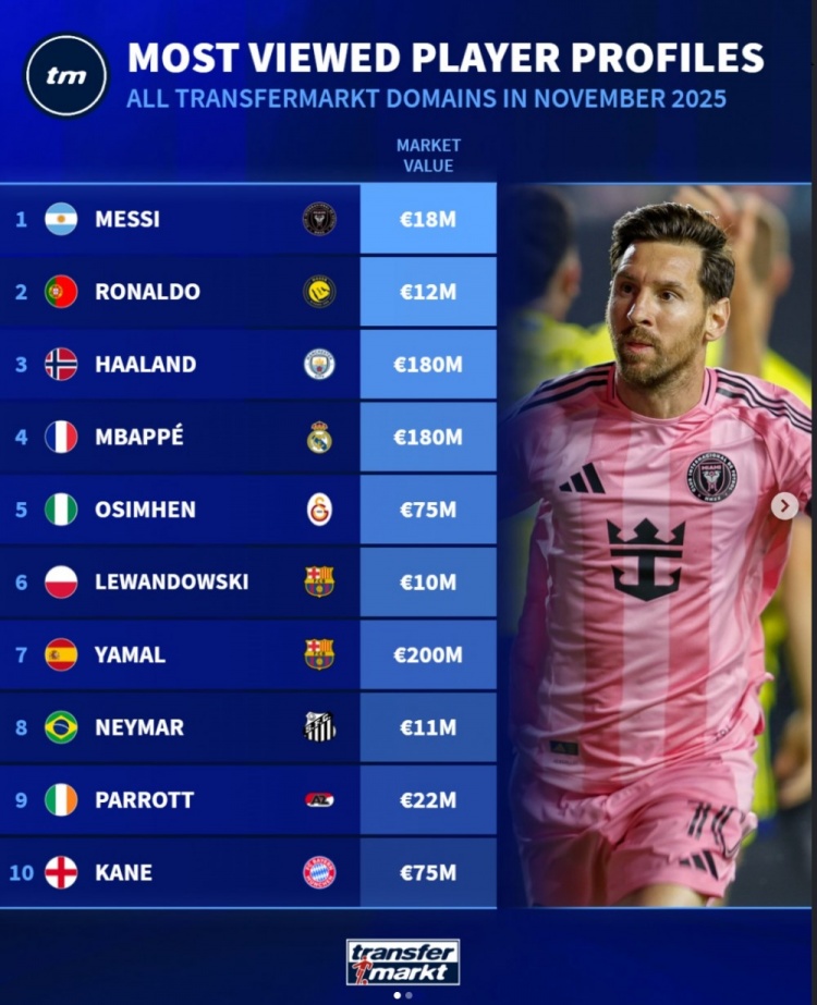 11月德转球员页面浏览量名次:前三循序为梅西、C罗、哈兰德