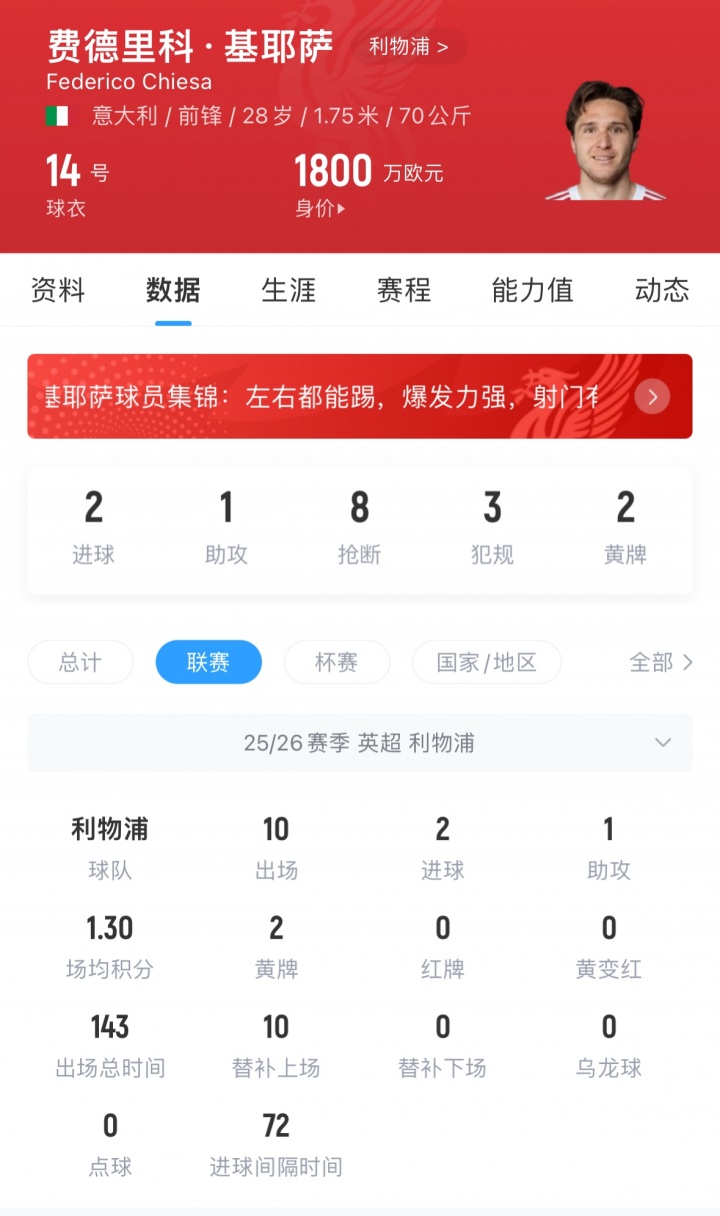 基耶萨现年28岁,他客岁从尤文加盟利物浦,为球队出场29次,孝顺4球5助,现身价1800万欧,周薪15万镑。