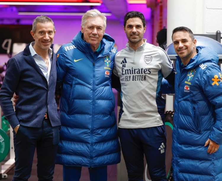 巴西队在阿森纳基地进行考验,安切洛蒂考验之前与阿尔特塔合影,巴西队社媒晒出像片。