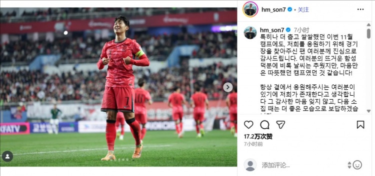 11月20日讯 孙兴慜更新外交媒体,感谢了在本次国度队集训时间来现场加油的韩国球迷。