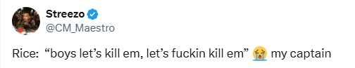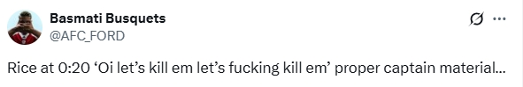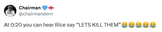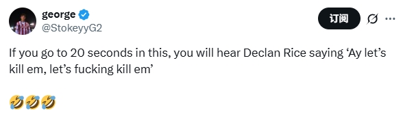 在埃泽下半场刚开场打进第二球,阿森纳3-0跨越时,赖斯在与队友庆祝时朝队友喊谈:“嘿!让咱们杀了他们,他X的杀了他们吧!”好多球迷在酬酢媒体指出,转播镜头赫然捕捉到了赖斯的这句话。