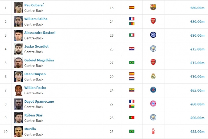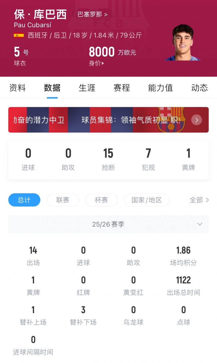 库巴西现年18岁,司职中卫,他本赛季为巴萨出场14次,现身价高达8000万,是大家后卫位置上身价最高的球员之一。