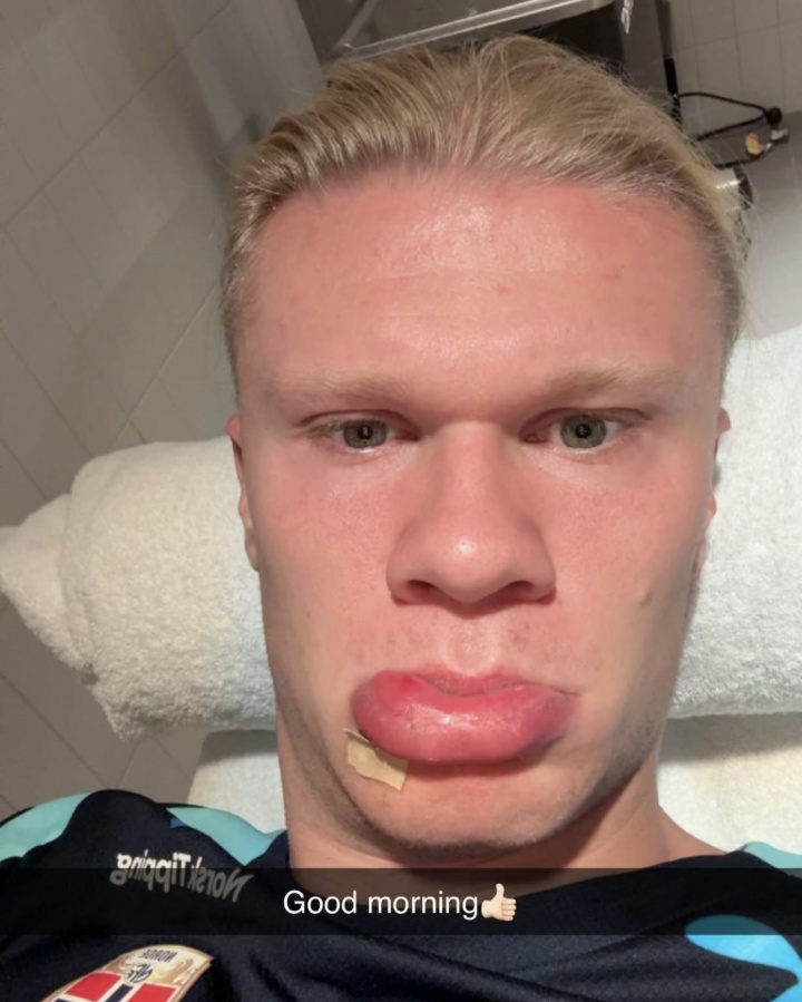 哈兰德周日从球队下榻旅店后门下车时,大巴的行李舱门斯须掀开,击中了他的脸部。哈兰德随后在冒昧媒体上裸露,他的伤口缝了三针。