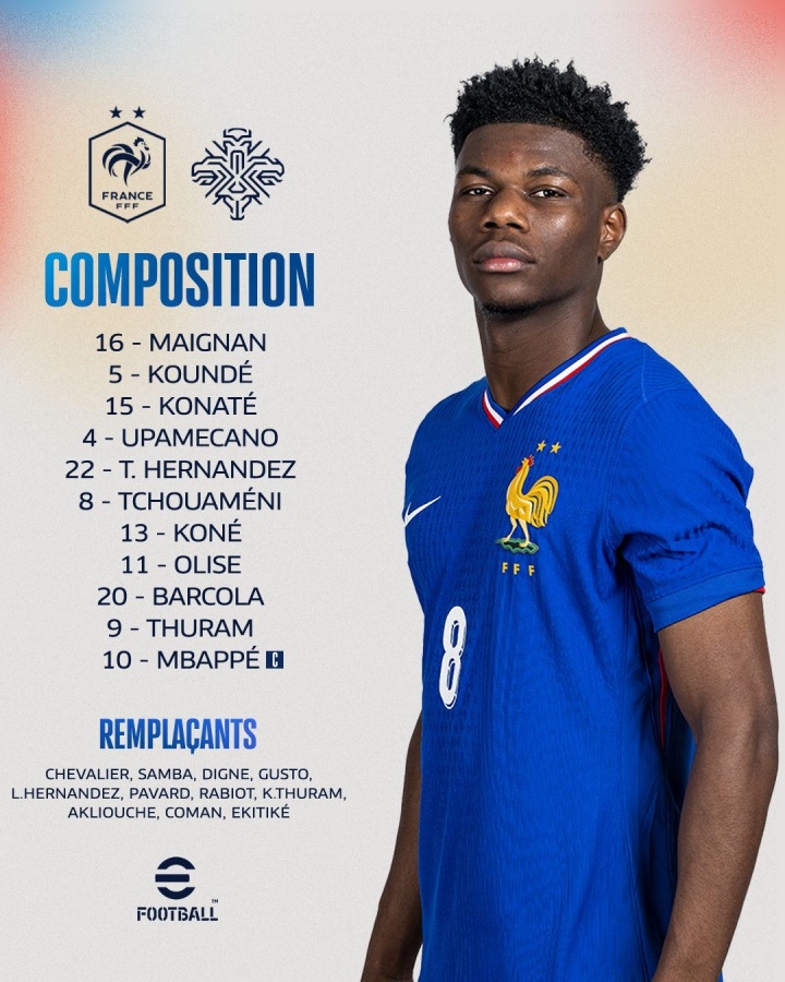 法国首发:16-迈尼昂、5-孔德、15-科纳特、4-于帕梅卡诺、22-特奥、8-琼阿梅尼、13-科内、20-巴尔科拉、11-奥利塞、9-小图拉姆、10-姆巴佩