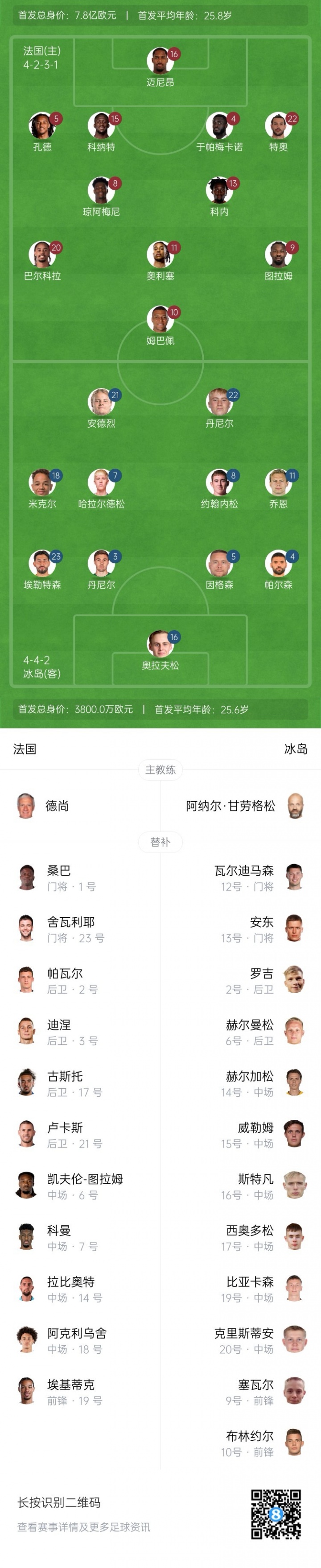 法国vs冰岛首发:姆巴佩、小图拉姆、奥利塞先发,巴尔科拉出战