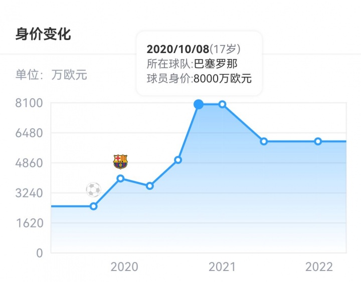 他在2020年达到了个东谈主巅峰身价8000万欧元,但随后受困于考虑伤病,身价一齐走低,咫尺仅剩500万欧。