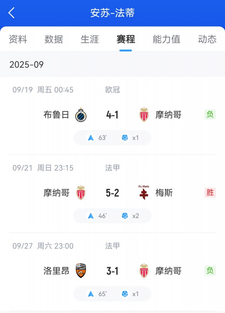 咫尺,法蒂也曾为摩纳哥出战3场比赛(均为替补登场),并在为数未几的上场手艺中打进了4个进球。