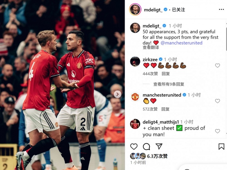 曼联后防铁闸!德里赫特:50次出场,拿下3分,感谢通盘撑抓!