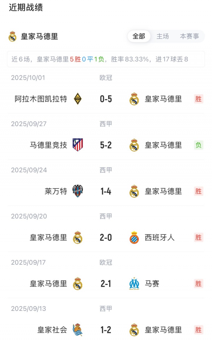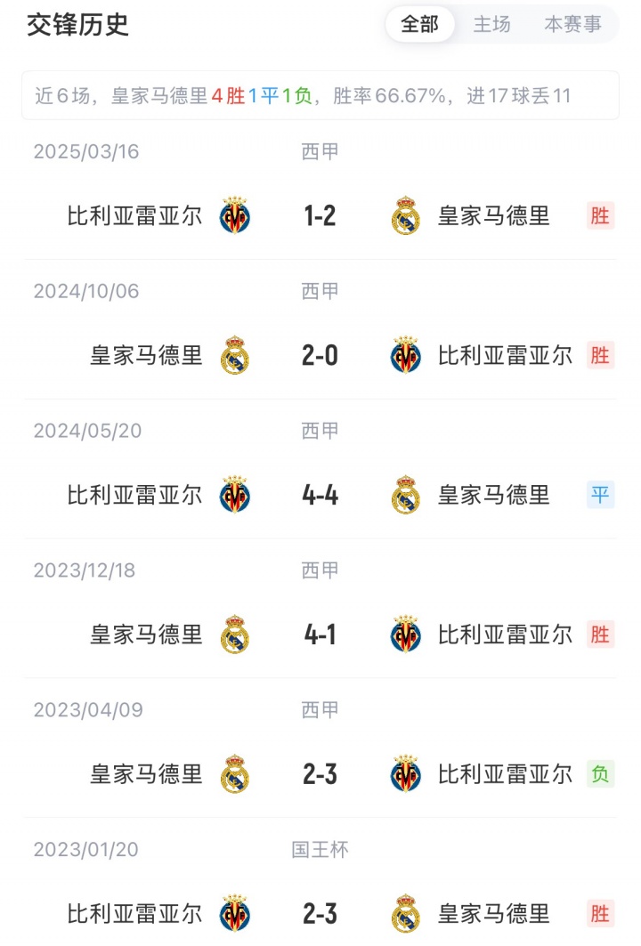 皇马当今6胜1负暂排第二,比利亚雷亚尔5胜1平1负暂排第三。皇马对比利亚雷亚尔已4场不败,上赛季双杀敌手。