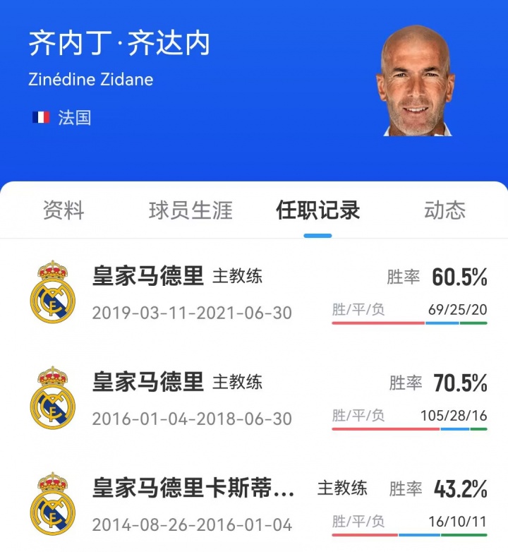皆达内2021年再度卸任皇马主帅一职后便一直休闲,他曾率领皇马得到欧冠冠军、西甲冠军等多项荣誉。