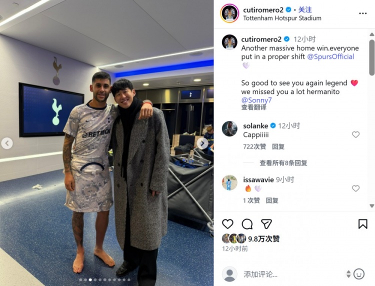 孙兴慜重回热刺主场,现任球队队长罗梅罗也在社媒晒出与孙兴慜的合照,配文写谈:“又拿下一场要道的主场告捷,每个东谈主皆作念出了我方的孝敬。很知足与球队外传相见,咱们太念念念你了兄弟!”
