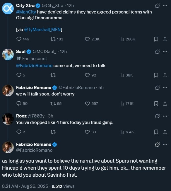 多纳鲁马来回有变?被曼城球迷喷是骗子,罗马诺恢复:爱信不信
