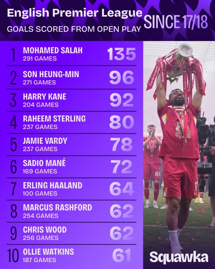 9月7日讯 squakwa统计了17-18赛季以来的英超融会战进球情况,萨拉赫135球断崖领跑。