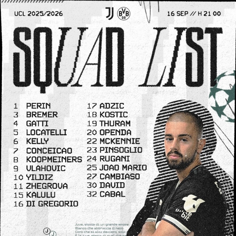 9月16日讯 北京工夫来日凌晨3点,尤文将在欧冠比赛中主场对阵多特。尤文公布了此役的球员名单。