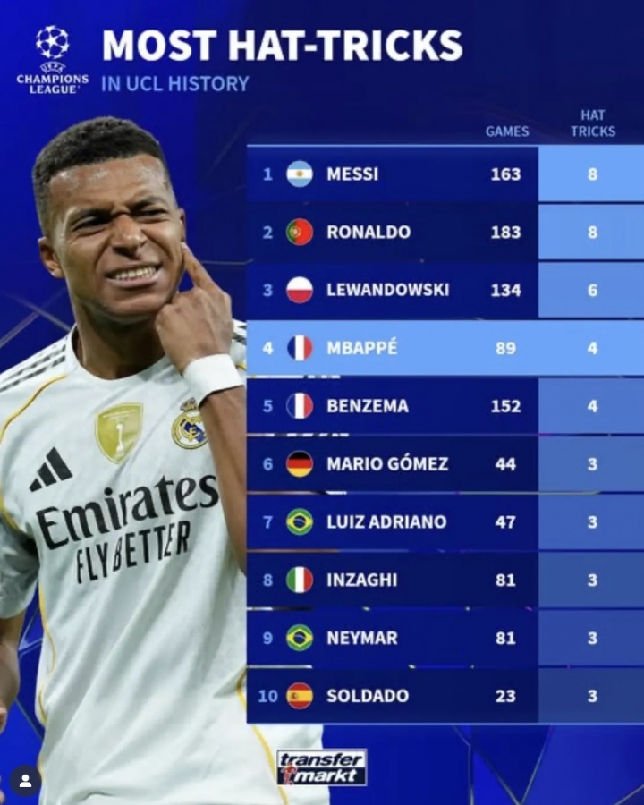 10月1日讯 在本轮欧冠,皇马5-0大捷阿拉木图凯拉特,姆巴佩演出帽子戏法,以下为欧冠历史演出帽子戏法次数榜: