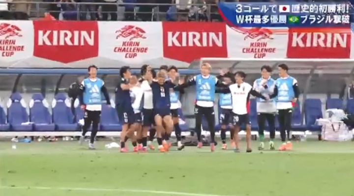 10月14日讯 麒麟杯国外友谊赛,日本主场让二追三逆转五星巴西,赛后日本替补席险些全员冲入场内姿色庆祝。这是他们历史初度打败巴西这一劲敌。