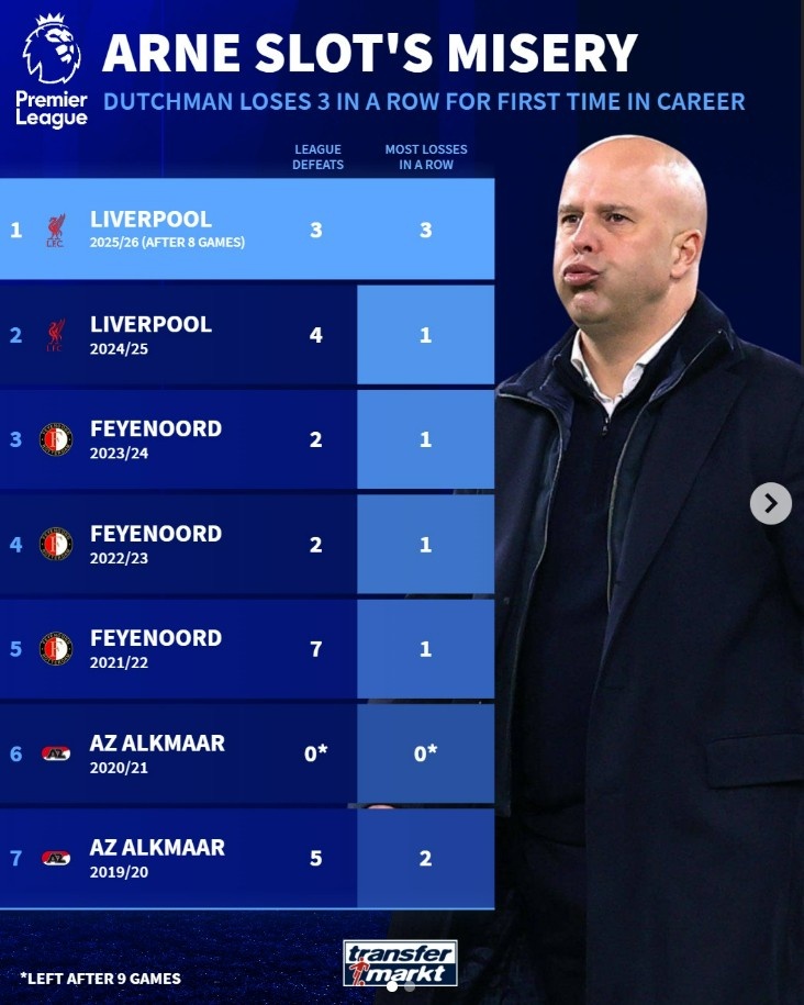 10月20日讯 在本轮英超,利物浦1-2不敌曼联。这亦然斯洛特抓教生计初度遭逢联赛三连败,以下为他抓教具体情况: