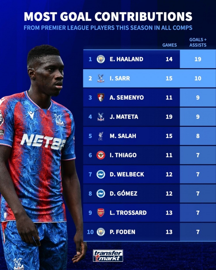 11月7日讯 德国转会市集统计了英超球员本赛季各赛事的参与进球数目,比肩出榜单,哈兰德参与19球居首,萨尔参与10球次席。