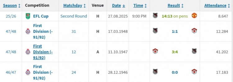 此外,在1946-47赛季联赛第24轮,两队0-0战平,格林斯比靠近曼联如故邻接四场不败。