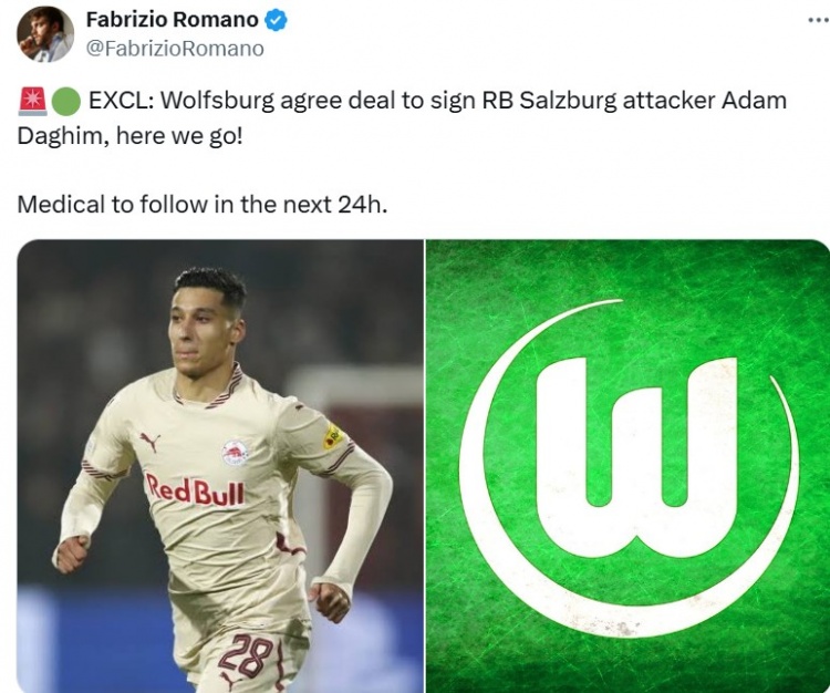9月1日讯 据闻明转会众人罗马诺报说念,沃尔夫斯堡行将签下萨尔茨堡红牛抨击手亚当-达吉姆,Here we go!