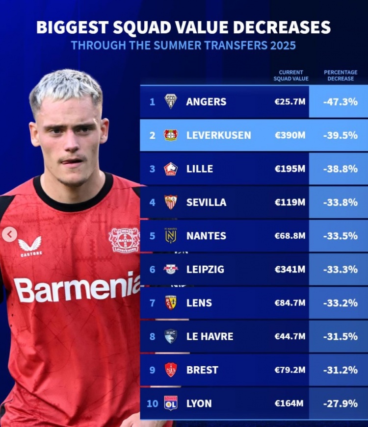 德转列今夏身价下降比例榜:法甲7队,药厂、塞维、莱比锡在列