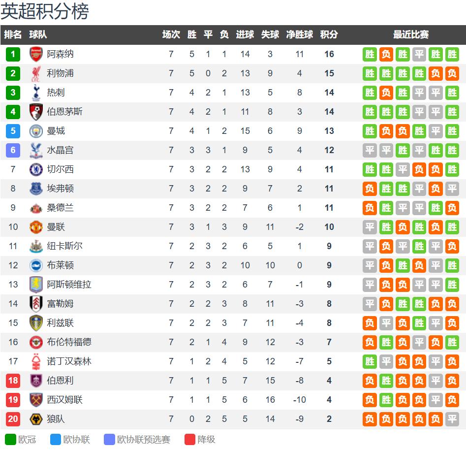 英超第7轮战况:伯恩茅斯3-1富勒姆、利兹联1-2热刺、阿森纳2-0西汉姆联、曼联2-0桑德兰、切尔西2-1利物浦、纽卡斯尔2-0诺丁汉丛林、阿斯顿维拉2-1伯恩利、狼队1-1布莱顿、埃弗顿2-1水晶宫、布伦特福德0-1曼城。
