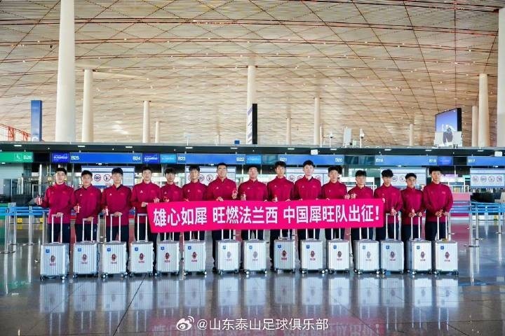 11月9日上昼,以山东泰山足球俱乐部U17梯队的15名男足显露员和2名西宾员为班底构成的中国犀旺队在齐门国际机场举行了出征庆典。中国足球协会副主席万建斌、中国足球作事联赛聚拢会书记长沈睿、山东省体育局二级调查员孙照亮、法国欧塞尔足球俱乐部董事会主席周云杰、山东泰山足球俱乐部副总司理宿茂臻等代表亲临现场,为行将远赴法国的小将们壮行饱读劲,见证这群足球少年开启国际换取的极新征途。
