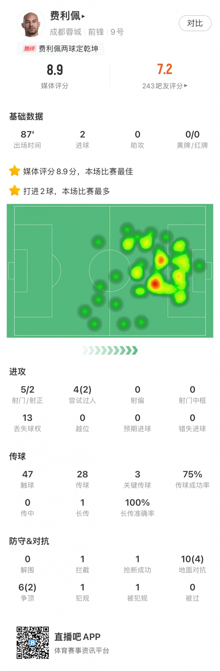 本场比赛,费利佩出场87分钟,他的5次射门里有2次射正,况兼一起造成进球。更为重要的是,费利佩在比赛下半时制造了对方门将王大雷的红牌,这也成为整场比赛的一大调整点。