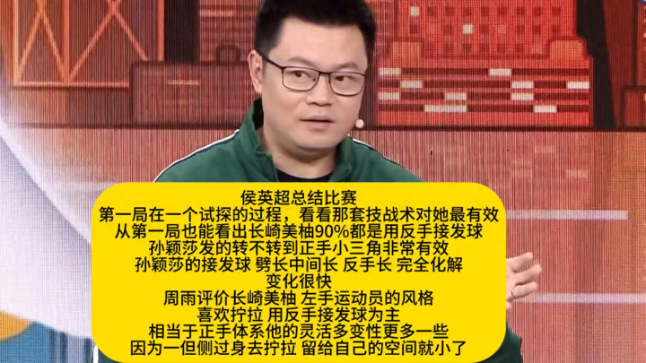 然后包括孙颖莎的接发球亦然我就劈劈中间长,以致劈反手长,就这两个球就完全的就把这个都备化解了。我嗅觉变化还辱骂常快的,是凭据场上的款式,包括也像你说的这个似的,我们都说旁不雅者清,他是在场内比赛比我们还清当局者清,对当局者比他们还更澄澈。