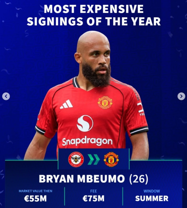 姆伯莫(26岁):布伦特福德→曼联,身价5500万,转会费7500万