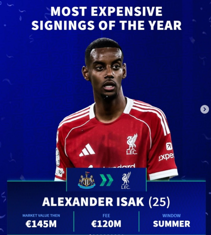 伊萨克(25岁):纽卡→利物浦,身价1.2亿,转会费1.45亿(图片有误)