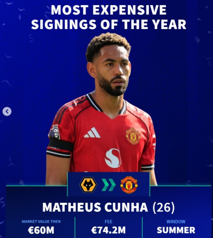库尼亚(26岁):狼队→曼联,身价6000万,转会费7420万