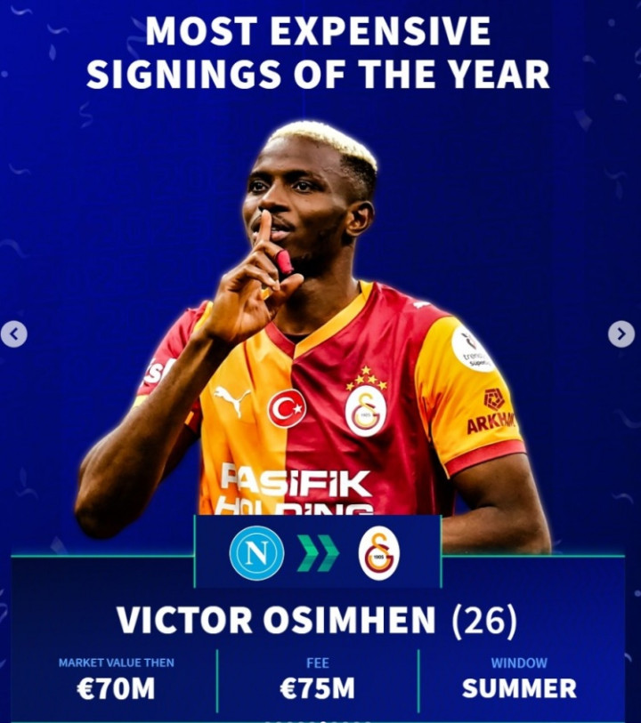 奥斯梅恩(26岁):那不勒斯→加拉塔萨雷,身价7000万,转会费7500万