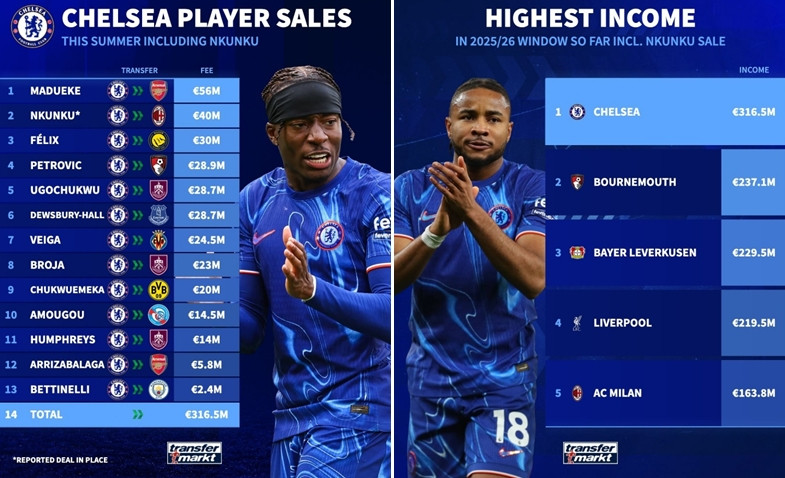 切尔西今夏的引援参加为2.9亿欧元,马雷斯卡麾下新增若昂-佩德罗、德拉普、吉滕斯、埃斯特旺和哈托等6名新援。接踵出售马杜埃凯、菲利克斯和恩昆库之后,切尔西今夏卖东谈主总收入将达到3.165亿欧元,成为欧洲“超市”中买卖额最高的一家。流程了这一番猛进大出之后,切尔西不仅增强了实力,还净赚了近3000万欧元,运营期间之奥秘可见一斑。